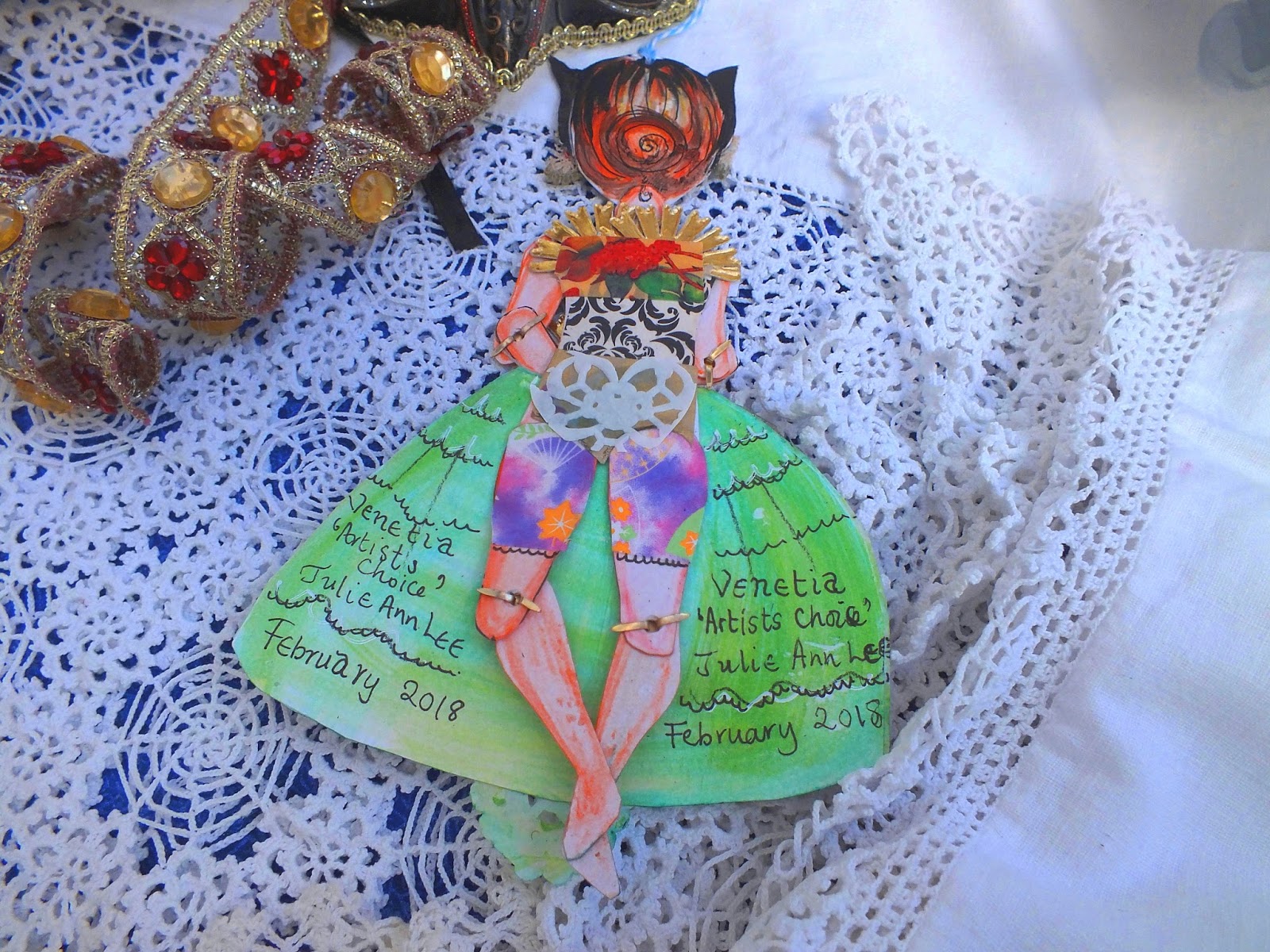 Although Venetia is not the first Art Doll I have created, she is my first paper doll and I had a lot to learn as I went along. She includes some of my own art work along with scraps from my designer paper scrap box.